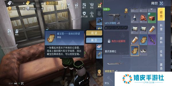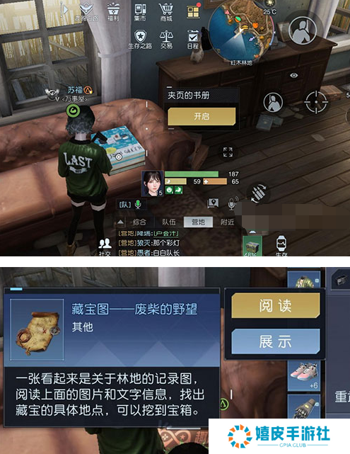 2、我们在房间中的沙发旁边找到夹页书册,点击开启即可获得废柴的野望藏宝图。