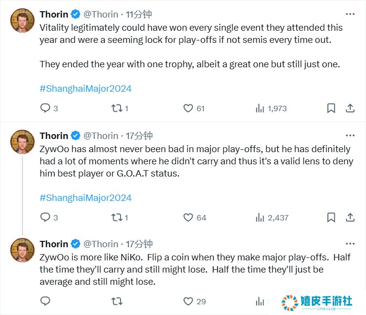 Thorin:“Vitality今年本来有机会赢得他们参加的每一场比赛,而且似乎每次都能进入淘汰赛,甚至是半决赛。 但他们以一座奖杯结束了这一年,虽然这是一座有含金量的奖杯,但仍然只是一座。 ZywOo确实在Major淘汰赛中从未表现糟糕,但他确实有很多状态不佳的时刻,因此可以完全否决他是最好的选手,或者说GOAT的地位。 他更像是NiKo。一到Major淘汰赛以后就像抛硬币一样,一半的可能会赢,但仍然会输;一半的时间只是表现平平,但仍然可能会输。” Vitality在上海Major的四分之一决赛中1-2输给 FaZe,告别了Major赛场。