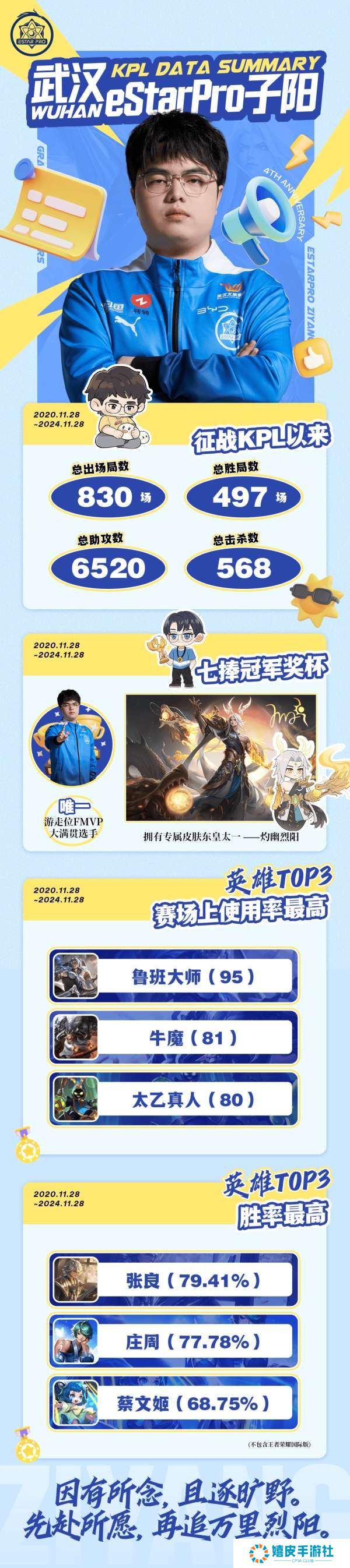 虎扑11月28日讯 eStar子阳四周年数据:唯一游走位FMVP,张良胜率最高,原文如下: