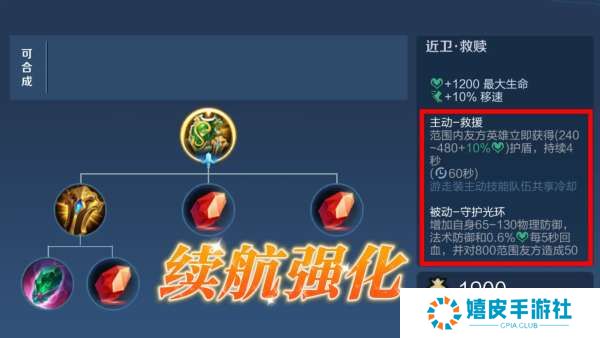 坦辅英雄强度提升,与辅助装备优化直接相关,近卫被动的守护光环,为坦辅提供了与最大生命值挂钩的续航,并为800范围友方生效50%。