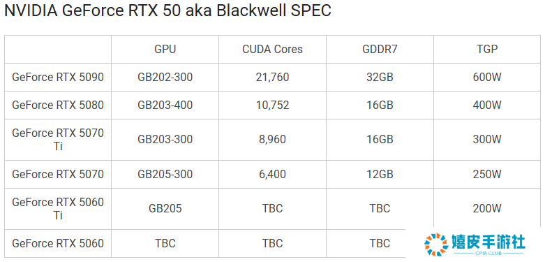RTX 50系列将全面升级支持PCIe 5.0,并且会首次使用GDDR7显存,注定成本更高,价格自然也会水涨船高。 尤其是NVIDIA显卡现在处于绝对领先地位,有媒体调侃称RTX 50系列除非自己搞砸,否则没有人可以对它造成任何影响,NVIDIA自然充分掌握着定价权。 当然,国内注定不可能有RTX 5090,因此应当会同步推出RTX 5090D,但具体如何阉割还不清楚,猜测以控制AI算力为主,图形性能应该不会有太大损失。 大体规格方面: RTX 5090:GB202-300核心,21730个CUDA核心,32GB GDDR7显存,600W功耗。 RTX 5080:GB203-400,10752个,16GB,400W。 RTX 5070 Ti:GB203-300,8960个,16GB,300W。 RTX 5070:GB205-300,6400个,12GB,250W。 RTX 5060 Ti:GB205,其余未知。 RTX 5060:完全未知。