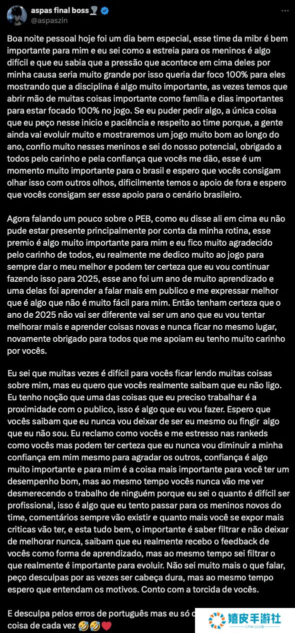 aspas更新社交账户发布长文,原文大意如下: 晚上好,大家好!今天是非常特别的一天,这支MIBR对我来说意义重大。我知道,对于这些小伙子来说,首次亮相是件非常困难的事,而我也清楚,由于我的原因,他们会面临很大的压力。所以,我想要将100%的关注放在他们身上,向他们展示纪律的重要性。有时候,我们不得不为了全心投入比赛而牺牲许多重要的事情,比如家庭和一些重要的日子。 如果我能请求一些事情,那么在这个开始阶段,我唯一的请求就是希望大家能给予耐心和尊重,因为我们还会有很大的成长空间,并且会在这一年中展示出非常精彩的比赛。我对这些小伙子们充满信心,也非常相信我们的潜力。感谢大家给予的关心和信任!对于巴西来说,这是一个非常重要的时刻,我希望你们能够以不同的视角来看待这一切。我们很少能得到外界的支持,我希望你们能够成为巴西电竞的支持力量。 现在谈谈PEB颁奖典礼,正如我之前提到的,由于我的日程安排,我没能亲自出席。这个奖项对我来说意义重大,我非常感谢大家的支持和喜爱。我真的非常努力地投入到比赛中,总是力求做到最好。请相信,我会继续在2025年保持这种状态。今年是我学习和成长的一年,其中之一就是学会更多地在公众面前表达自己的想法,这对我来说并不是一件容易的事情。请相信,2025年也会是我努力提升自己、学习新事物的一年,我永远不会停滞不前。再次感谢所有支持我的人,我对你们充满感激。 我知道,很多时候你们读到关于我的各种消息会感到不舒服,但我希望你们真的能明白,我并不在意。我清楚自己需要改进的一点是与大家的互动,这是我将努力去做的。我希望你们知道,我永远不会改变自己或假装成什么样的人。我会像你们一样在排位赛中抱怨、发脾气,但请相信,我绝不会为了取悦别人而降低对自己的信心。自信对我来说非常重要,也是取得好成绩的关键。但与此同时,你们也永远不会看到我贬低任何人的努力,因为我知道成为一名职业选手有多么不容易。这也是我一直试图传达给队里新人的理念。评论总是会存在的,而且曝光度越高,批评就越多,这没关系,重要的是懂得筛选,并且永不停止进步。请相信,我确实会把你们的反馈当作学习的方式,但与此同时,我也知道如何过滤出真正对我成长有帮助的内容。我也不知道还能说什么了,如果有时我显得固执,请原谅我,但同时也希望你们能理解原因。我需要你们的支持。