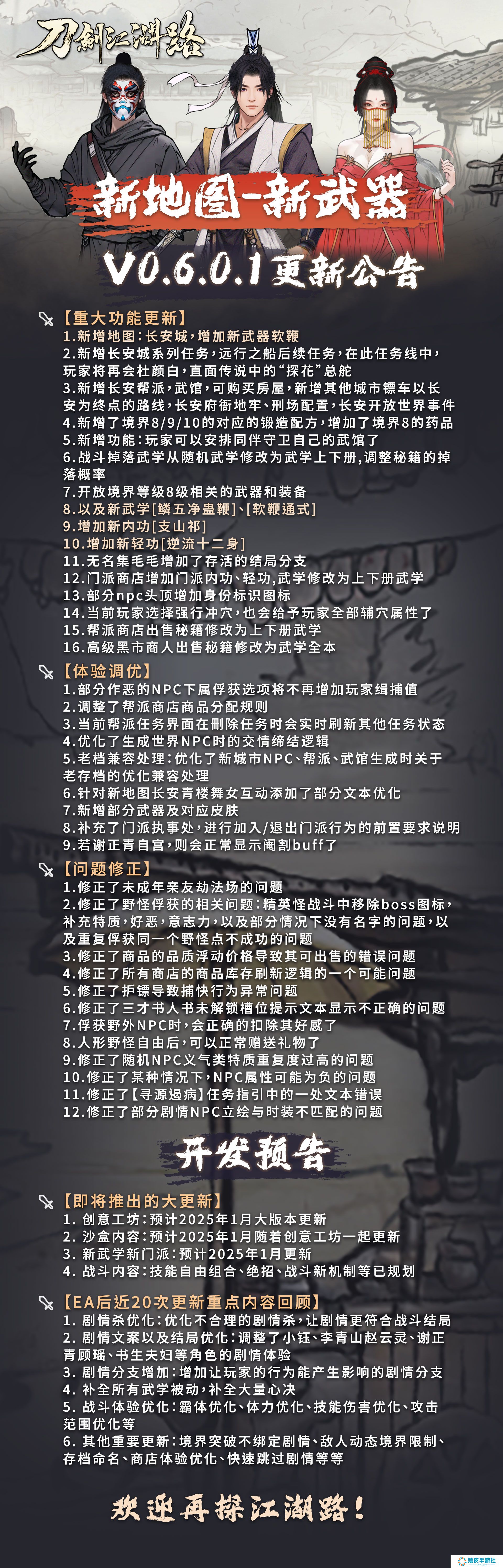 由游鲤化龙工作室开发,CaptchaGames发行的武侠RPG《刀剑江湖路》11月大更新V0.6.0.1版本现已上线!本次更新将会带来新地图【长安城】及其系列剧情支线和新武器【软鞭】,更有对应的新武学心法、轻功内功,少侠们下载更新内容即可体验。 全新地图:长安城内墓室暗藏玄机 游戏发售至今两月有余,游戏更新20多个版本,制作组对游戏剧情进行大量优化基础上,不断填充玩法内容。本次更新版本将会开启在长安城的剧情支线。玩家需完成前置任务【远行之船】后从襄阳城的北面传送至长安。通过支线任务,玩家能够了解到长安城从往日繁华到此间遍地饥民的前因后果。而诸多线索指向的地下墓室有何玄机?墓室内又为何全是探花高手,而杜颜白因何现身墓室?