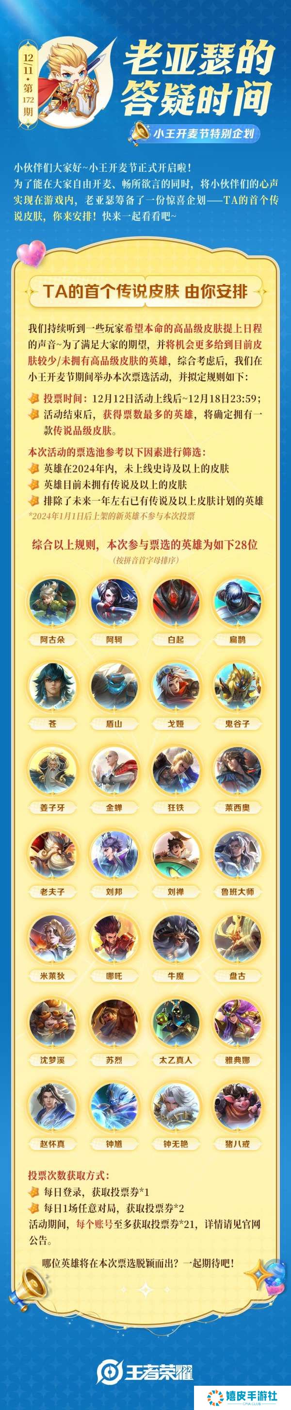 小伙伴们好,今天老亚瑟带来的是小王开麦节惊喜企划——TA的首个传说皮肤,你来安排!
