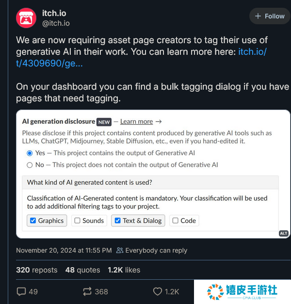 专注为独立游戏开发者提供支持和销售的平台网站 itch.io 日前宣布了一项新政策,要求平台上分享游戏或游戏开发资产的开发者澄清他们的作品是否使用了生成式 AI,并且明确哪些部分是由 AI 生成的。
