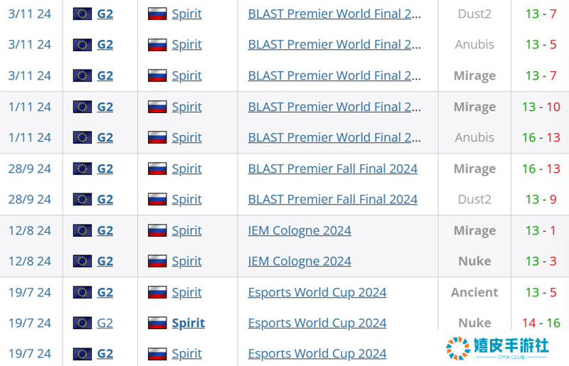 在欧洲RMR B组比赛1-2不敌G2后,Spirit已经连续6场比赛不敌G2,而在过去15场交手中,Spirit仅仅击败过G2两次。