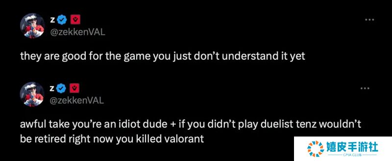 随后zekken下方评论:他们对游戏是有好处的,你只是还不明白。太可怕了,你是个白痴+如果你不玩决斗位,tenz现在就不会退役了,你毁了瓦洛兰特。