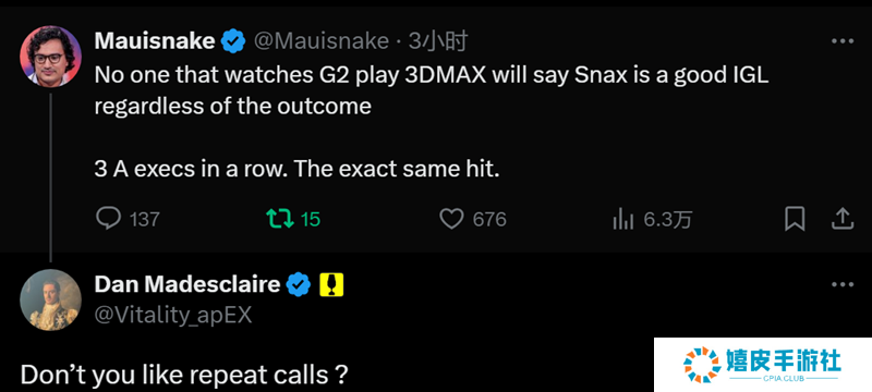 “不管结果如何,相信只要看过G2和3DMAX这场比赛的人不会觉得Snax是个优秀的指挥了吧。 连续三把进攻A点,完全一样的套路。” 而底下apEX评论道:“意思是你不喜欢重复的指令?”