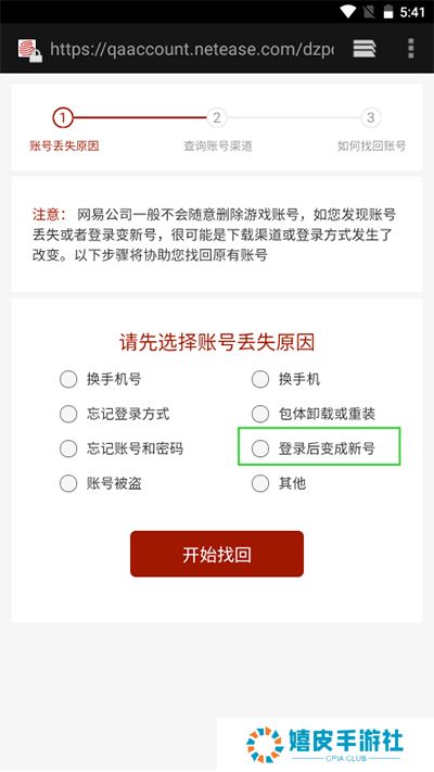 3、选择原因为【登录后变成新号】,再点击【开始找回】。