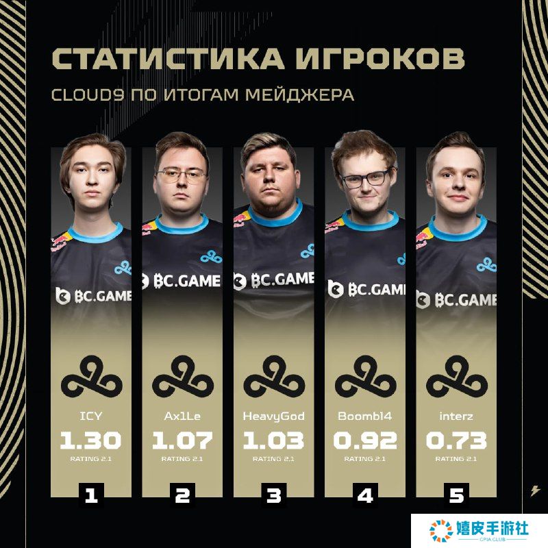 在刚刚结束的上海Major开幕式阶段瑞士轮1-2组的生死战中, Cloud9以0-2的比分不敌 Complexity战队被淘汰出局。赛后,有外媒统计了本次赛事Cloud9战队5名选手的数据情况,其中,狙击手ICY打出全队最高的1.30 rating,步枪手Ax1Le和HeavyGod也有中规中矩的发挥。而interz则是仅打出0.73 rating全队垫底,甚至比指挥Boombl4的0.92 rating相差甚远。  上海Major开幕阶段 C9   COL 13 Vertigo 168 Ancient 13 以下为Cloud9战队5名选手在本次上海Major的数据排行:
