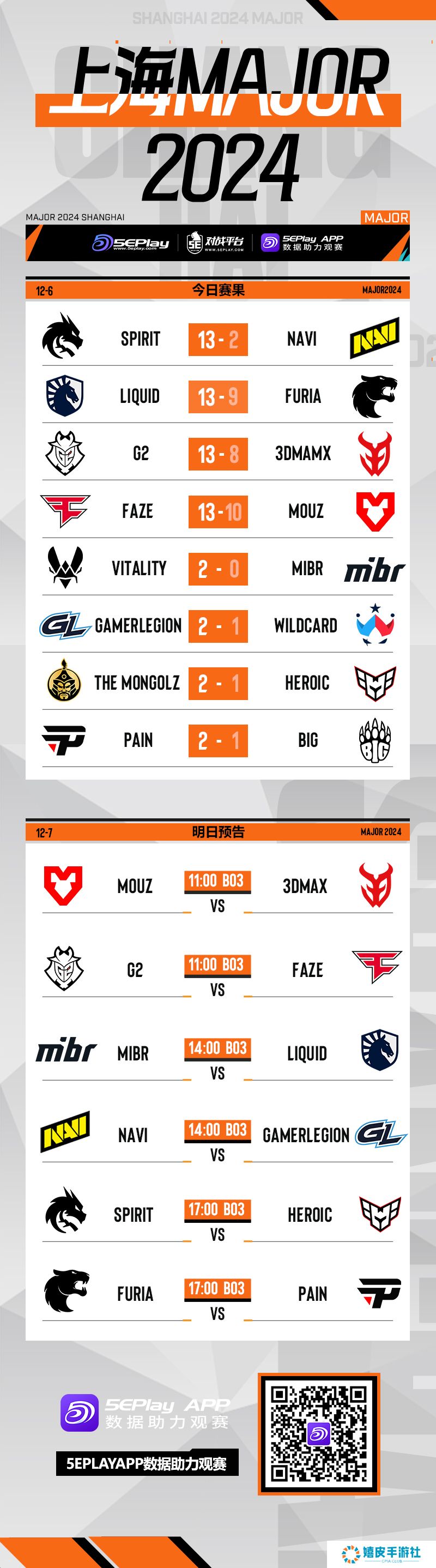 上海Major正赛阶段第二日比赛也已结束,第二日比赛中,亚洲独苗The MongolZ战胜HEROIC,创造历史挺进淘汰赛,同样3-0晋级淘汰赛的还有Vitality。而BIG和Wildcard则是没能在生死战中成功续命,以0-3的成绩遭遇淘汰。而在四轮的BO1中,MOUZ、Natus Vincere、FURIA、3DMAX落败掉入1-2组,G2、FaZe、Liquid、Spirit来到2-1组,距离晋级仅一步之遥。以下为今日赛果、明日预告和积分榜一览。