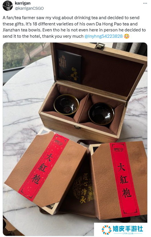 在上海Major赛事期间, FaZe指挥karrigan收到了一份特别的礼物,由中国粉丝自家生产的18种不同品种的大红袍茶叶以及两只建盏茶碗(福建省南平市建阳区特产)。大表哥在个人社交媒体账号上分享了这一消息。 “一位茶农粉丝看到了我以前喝茶的视频,决定送我这些礼物。这是他家里自种自制的18种不同品种的大红袍茶叶和建盏茶碗。虽然他本人不在(上海),但他还是决定寄到我住的酒店来,非常感谢”