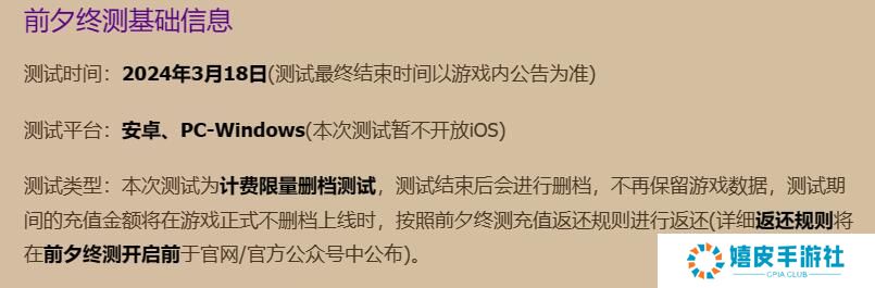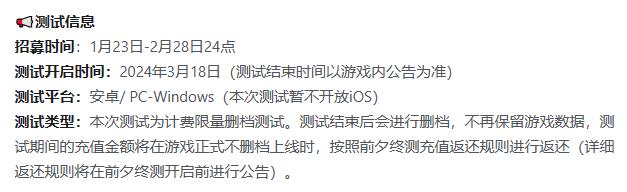 目前游戏暂未正式上线,不过在最终测试时测试平台为【安卓、PCwindows】两个端。
