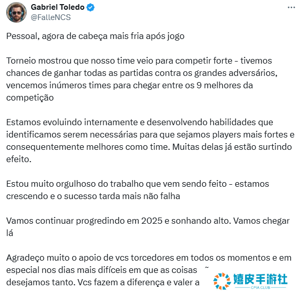“兄弟们,赛后我将以更冷静的头脑进行发言。 这次上海Major之旅表明,我们队伍有能力在这里大显身手,我们有机会战胜所有强敌,我们击败了无数队伍,并进入了前九名。 我们正在进行由内向外的发展,训练必要的技能,使我们成为更强的选手,从而让FURIA成为一支更好的队伍。其中许多训练项目已经取得了成果。 我为大家所努力的成果感到自豪,我们正在成长,是的,成功的道路是缓慢的,但却是天道酬勤的。 让我们在2025年继续前进,实现更远大的梦想,我们一定能成功。 非常感谢粉丝朋友们一直以来的支持,尤其是在那些最艰难的日子里,当我们陷入低谷的时候。你们对我们很重要,谢谢你们。”