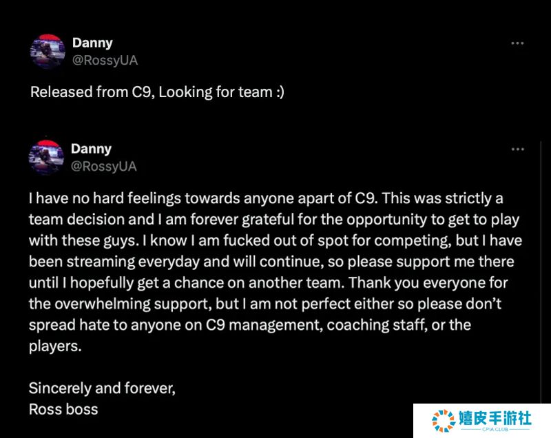 Rossy发文离开C9:这是队伍的决定,感谢能和他们一起打比赛。