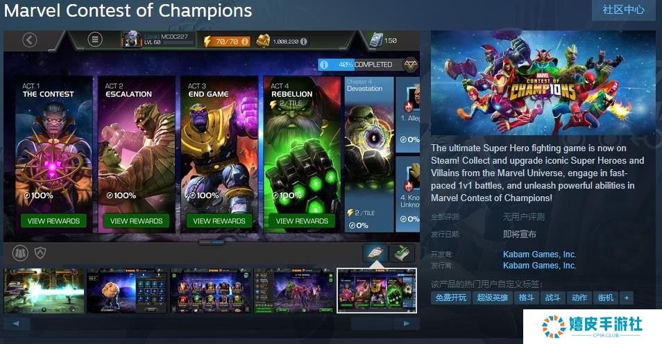 游戏介绍: 终极超级英雄格斗游戏现已上线Steam!收集并升级来自漫威宇宙的标志性超级英雄和反派,参与快节奏的1v1战斗,在《漫威:超级争霸战》中释放强大的技能! 游戏特点: 欢迎来到超级争霸战 收藏家召唤你与漫威宇宙中的顶级角色展开战斗!组建你的超级英雄和反派团队,在动态的1v1战斗中击败对手,开启你成为终极冠军的征途! 打造你的终极团队 组建一支强大的冠军团队,包括复仇者联盟、X战警、银河护卫队等!收集、升级并合理管理你的冠军角色,提升他们的属性、能力和强大的特殊技能! 任务与战斗 以经典漫威叙事风格体验令人兴奋的故事情节!踏上任务,击败强敌,并与一个神秘的宇宙新势力对抗,拯救多元宇宙免于彻底毁灭! 与好友一同战斗 与朋友和其他召唤者组队,打造最强联盟!在联盟活动中争夺高位,与来自世界各地的其他联盟一较高下! 全新玩法 《超级争霸战》已经为PC进行了重新设计和优化!使用你最喜欢的控制器或键盘,并自定义按键绑定,享受更沉浸的游戏体验! 支持无缝跨平台游戏,可在PC和移动设备之间自由切换,无论从哪里开始,都能随时续玩! 服务条款 在使用我们的服务前,请阅读服务条款协议和隐私声明,因为它们会规范你与Kabam之间的关系。 游戏截图: