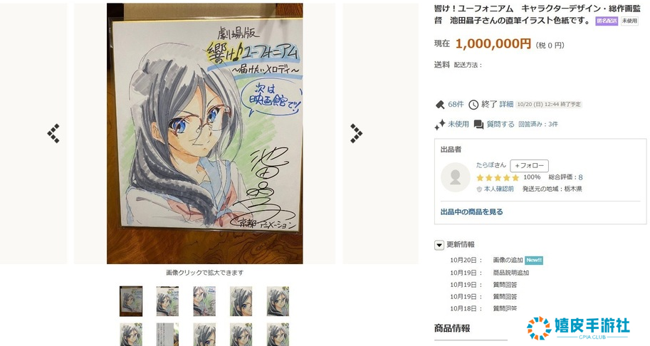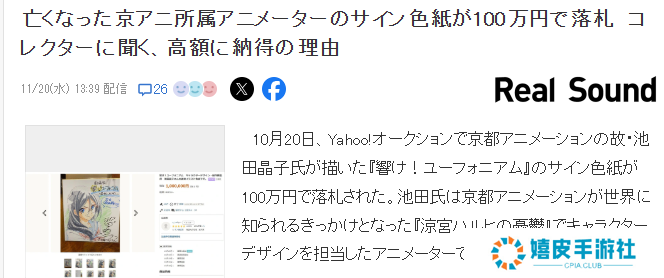 10月20日今天,雅虎拍卖宣布一张由京阿尼事件遇害动画师池田晶子签名插画(色纸)遗作拍出100万日元。