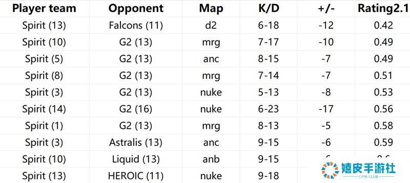在先前进行的上海Major 欧洲RMR的比赛中, Spirit战队再度被 G2击败。 虽然坐拥donk这样的顶级枪男,但Spirit战队在面对G2时却屡屡折戟。时至今日,Spirit在对阵G2时已经遭遇六连败的尴尬窘境。虽然donk在采访中表示每次和G2交手,队伍都在进步。但事实上在笔者看来这句话更多的是安慰,因为Spirit有时候面对G2打得难解难分,但有时候则是被**分带走。因此今天通过本文分析下为什么Spirit难克G2心魔? 一、面对G2,magixx特别“马西西” 虽然 Boris Vorobiev | magixx、 Myroslav Plakhotia | zont1x和 Leonid Vishnyakov | chopper经常被直播间吐槽是吉祥三宝,但如果从数据看,吉祥三宝在对阵G2时的发挥也不尽相同。尤其是magixx似乎尤其被G2战队所克制。笔者查看了Spirit战队选手今年倒数十张地图数据(数据截止到上海Major揭幕战阶段开始之前)。如果各位仔细查看,会发现五位选手的十差地图数据中G2占比不尽相同。chopper为四张地图,作为指挥这样的数据完全能够接受。zont1x为三张图,是不是有些意外?zont1x在面对G2时很多时候还是宗主。 Danil Kryshkovets | donk为三张地图, Dmitry Sokolov | sh1ro也是三张地图。而到了magixx,则猛增到六张地图,这个数字甚至超过了指挥chopper。