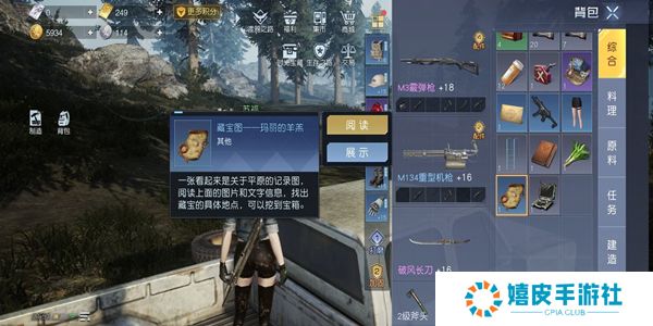 2、我们到达目的地,在森林中找到如图所示的一个孤零零的背包打开即可获得藏宝图。