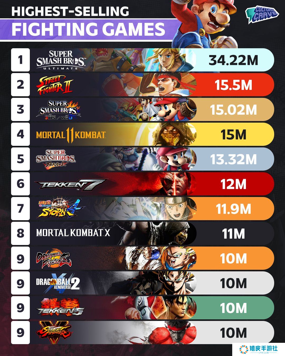 如下文所示,《任天堂明星大乱斗特别版》以超过3500万份的销量在格斗游戏品类的销售排行榜上占据主导地位。这一销量远远超过了排名第二的游戏,而排名第二的恰好是有史以来最具标志性的格斗游戏之一——《街头霸王2》。然而,只需再往下看一个名次,就能看到任天堂旗下该系列的另一款游戏,而且它还占据了第五的位置!
