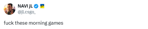看来jL还没习惯在上午开始比赛的节奏。 在 Natus Vincere与 Liquid的比赛结束后,jL在个人社交媒体账号上分享了对上海Major传奇组首轮比赛的感受。  上海Major2024 NAVI   Liquid 13 Nuke 10 “***这些上午的比赛。”