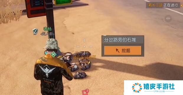 2、我们传送抵达后,来到分岔路如图所示的路灯这,点击挖掘分岔路旁的石堆。