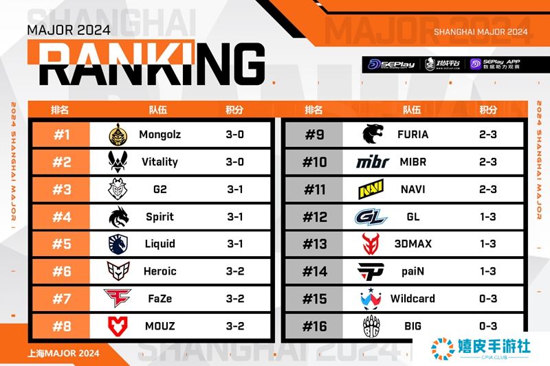 上海Major正赛阶段所有比赛已经全部结束,在最后一日比赛中,MOUZ、HEROIC、FaZe成功搭上前往淘汰赛的末班车,MIBR、Natus Vincere、FURIA则是遭遇淘汰。以下为今日赛果和积分榜一览。