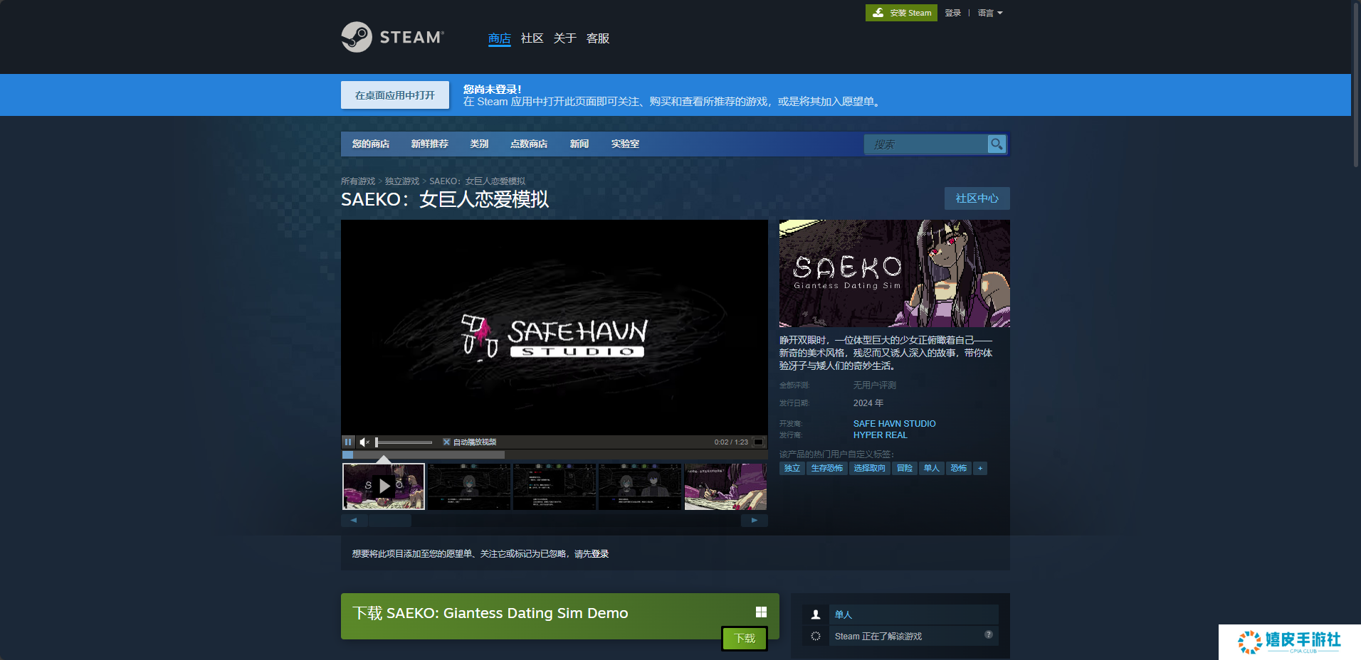 《SAEKO:女巨人恋爱模拟》是一款恐怖恋爱模拟游戏,而这款游戏的官网地址就是一个官网页面,另外Steam平台的购买页面也算官网,进入到这个游戏的购买页面基本上就能知道所有这款游戏的信息。