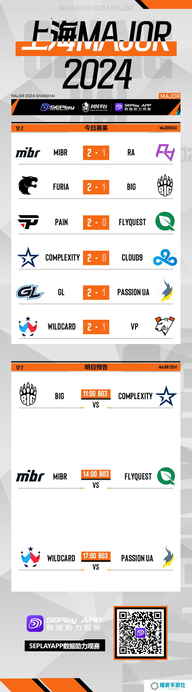 上海Major开幕阶段第三日比赛已经结束,在第三日比赛中,GamerLegion、FURIA、paiN锁定了三张传奇组的门票,而中国队伍Rare Atom、Cloud9、Virtus.pro则是遭遇淘汰。以下为今日赛果、明日预告和积分榜一览。
