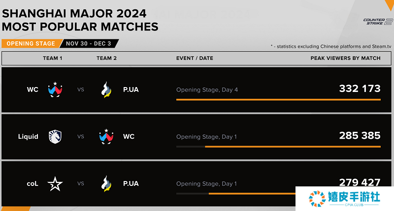 上海Major是今年的最后一场大型CS赛事,开幕赛阶段自11月30日开始,并于12月3日落下帷幕,本文统计了开幕赛阶段的国外观众观赛数据。目前上海Major的小组赛正如火如荼地进行中。 开幕赛阶段最受欢迎的一场比赛是 Wildcard对阵 Passion UA,最高同时在线观众人数超过32.5万。总体而言,比起2024哥本哈根Major,中国观众数量较少,但淘汰赛阶段的情况可能会有所改变。 开幕战阶段中表现突出的队伍是 The MongolZ和 Liquid。两支队伍都拿到了全部胜利。巴西队伍的表现也非常出色,其中三支队伍 FURIA、 paiN、 MIBR、进入了正赛阶段。另一方面,东欧队伍的运气不太好—— Virtus.pro和 Cloud9在第四轮后被淘汰,而Passion UA则未能晋级,在最后的加时赛中输给了Wildcard。 开幕赛结束后,八支队伍晋级正赛:The MongolZ、Liquid、 GamerLegion、FURIA、 paiN、Wildcard、BIG和MIBR。这些队伍将与另外八支提前晋级传奇组的队伍一起比赛。 2024上海Major开幕赛观众统计