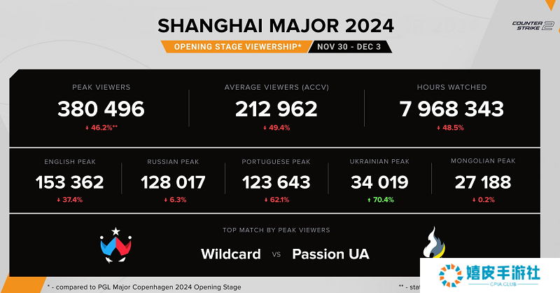 图中分别展示了观众人数峰值、平均收视人数、观看小时数以及英文、俄语、葡萄牙、乌克兰、蒙古观众峰值人数。数据不包括中国平台统计数据。 从统计数据来看,2024上海Major的观赛人数明显落后于上届哥本哈根Major。与2024哥本哈根Major相比,上海Major总观赛人数下降了一半,部分语言的收视率较上届高峰下降了60%以上。 下降的主要原因是时差问题——CS的主要观众在欧洲和巴西,但开幕赛阶段的比赛在这些地区都是在夜间或凌晨举行的。因此,哪怕巴西队伍在开幕赛阶段的表现很好,在巴西最受欢迎解说Gaules的直播间内,平均观众人数也从11万下降到了2万。英文网红解说ohnepixel直播观众人数从3.4万人下降到1.8万。其他视频平台也出现了类似的情况。 唯一例外是乌克兰地区,与2024哥本哈根Major相比,最高观赛人数增长了70%。原因是乌克兰队伍Passion UA参加了开幕赛阶段比赛,上届Major开幕赛阶段没有乌克兰战队,因此当时乌克兰地区的观众对比赛几乎没有兴趣。 俄语地区的表现也值得关注。虽然整体峰值观赛人数下降6.3%,但热门主播的平均观赛人数却有所上升。 国外平台上的中文直播也比上届赛事吸引了更多观众。不过没有对赛事整体观赛人数产生太大影响,因为英语、葡萄牙语、波兰语、土耳其语和俄语等主要语言的观赛人数都出现了下降。 上海Major开幕赛阶段最热门的比赛