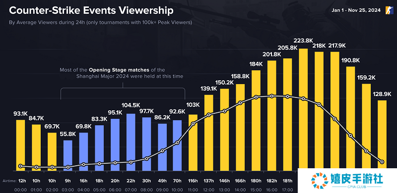 柱状图蓝**域为上海Major开幕赛阶段的比赛时间和24小时内平均观看人数(仅统计观众人数超10万的CS赛事) 该数据包括2024年所有观众人数超过10万的CS赛事。数据显示,观赛人数高峰通常在格林威治标准时间下午六点至晚八点之间,而2024年上海Major的几乎所有开幕赛阶段赛事都在格林威治标准时间凌晨三点至上午十点之间举行。此时除东八区的观众外,大多数观众不会观看比赛。