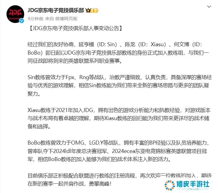 直播吧12月10日讯 官方消息,JDG俱乐部在刚刚公布三则人员变动公告;Sin、Xiasu、BoBo三名教练加入教练组。
