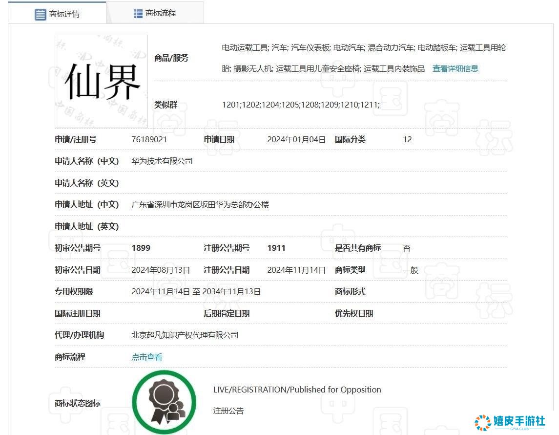 商标详情页面显示,华为注册成功的“仙界、天界、君界”商标,均于今年1月4日申请,注册公告日期为11月14日。