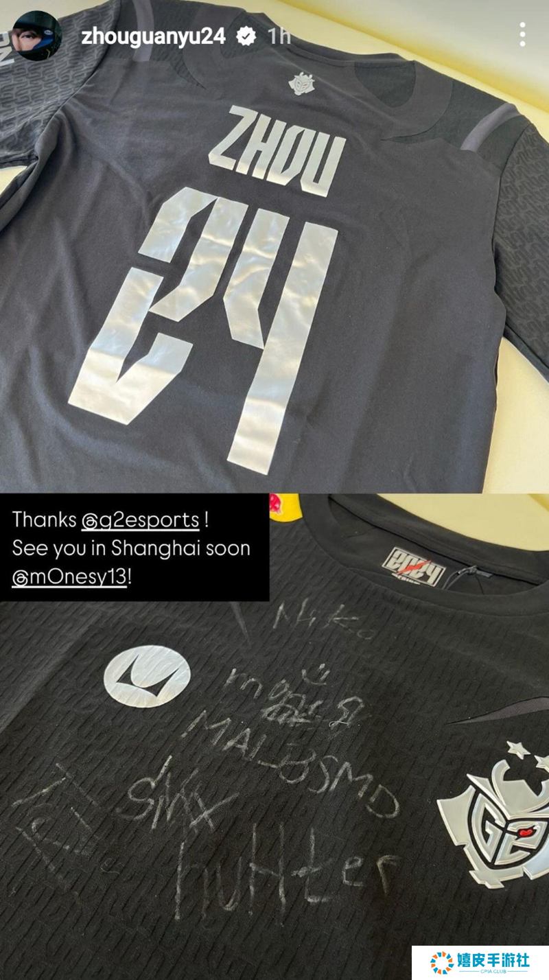 F1车手周冠宇在社交平台上晒出了G2队员的签名队服。