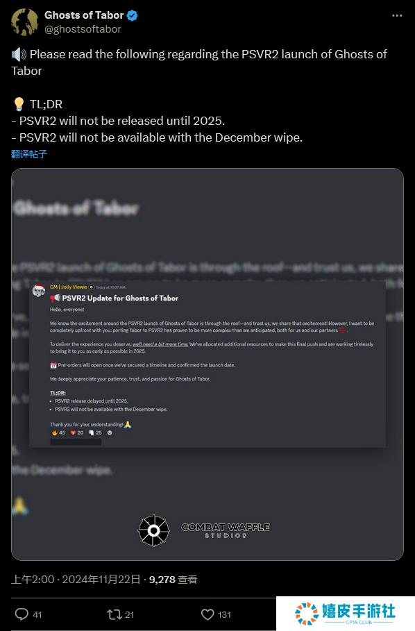 在社交媒体上的一篇帖子中,开发者对延期进行了解释,写道:“我们知道《塔博尔幽灵》在PSVR2 上即将在发布令人兴奋不已- 相信我们,我们也有同样的兴奋!然而,我想完全坦白地告诉大家:事实证明,对于我们和我们的合作伙伴来说,将《塔博尔》移植到PSVR2 比我们预期的要复杂得多。” “为了提供你们应得的体验,我们需要更多时间。我们已经分配了额外的资源来完成这最后的努力,并正在不懈努力,以便在2025 年尽早向各位提供游戏。一旦我们确定了时间表并确认了发布日期,就会开放预购。”