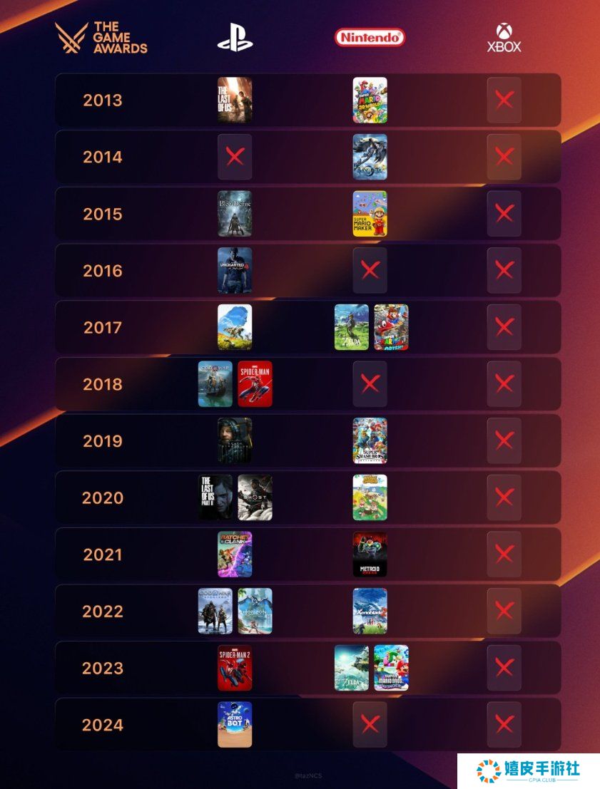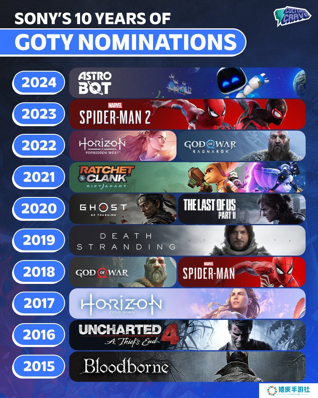 过去10年,PlayStation推出了《漫威蜘蛛侠2》、《战神4》、《对马岛之鬼》等多款游戏,获得了广泛好评和商业成功。这种前所未有的质量水平让PlayStation在过去十年中每年都能在年度游戏竞赛中获得一席之地。 今年“年度游戏”的提名作品包括《宇宙机器人》以及《黑神话:悟空》和《艾尔登法环:黄金树幽影》等。 这是这家游戏巨头连续第10年获得“年度游戏”提名。作为背景,自2015年以来,入围年度游戏角逐的SIE游戏有: 《诅咒" target="血源诅咒">血源诅咒》 《神秘海域4》 《地平线:黎明时分》 《战神》和《漫威蜘蛛侠》 《死亡搁浅》 《对马岛之鬼》和《最后的生还者 第二部》 《瑞奇与叮当:分离》 《战神5:诸神黄昏》和《地平线:西之绝境》 《漫威蜘蛛侠2》 《宇宙机器人》 其中,PlayStation在2018年、2020年和2022年都获得了两次提名,巩固了其第一方游戏的声誉。需要注意的是,除了《血源诅咒》和《死亡搁浅》外,榜单上的所有游戏均来自PlayStation内部团队。
