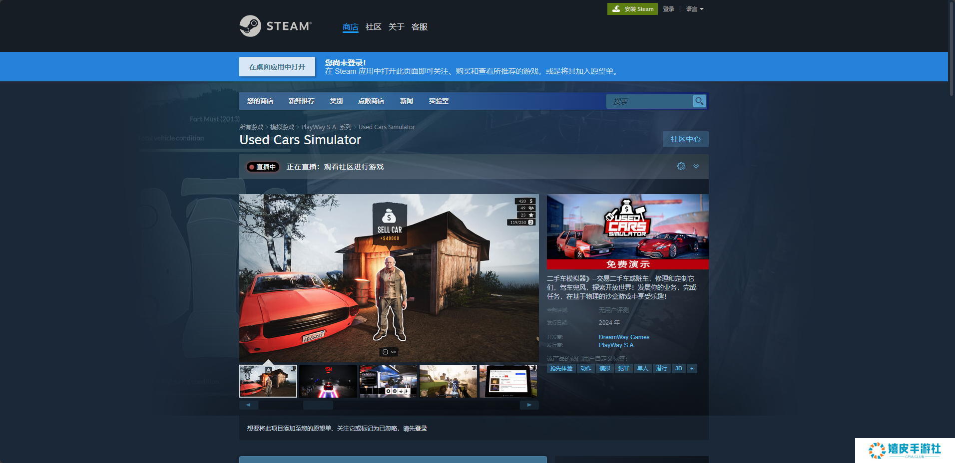 《二手车模拟器》是一款非常有趣的模拟物理沙盒游戏,而这款游戏想要下载还是比较麻烦的,下载的第一步就是安装Steam平台,然后注册账号登录,并且搜索“Used Cars Simulator”,然后点击购买,之后点马上开玩即可。