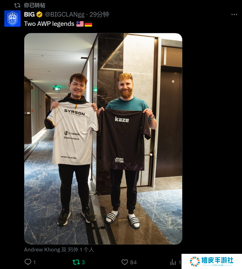 日前BIG战队官方账号在社交平台上发布动态,表示两位传奇狙击手见面。照片中的内容是 Rare Atom狙击手kaze和BIG狙击手syrsoN互换队服。