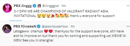 2024无畏契约源能亚洲邀请赛决赛,PRX以3-1的比分战胜DFM,夺得冠军。赛后,Jinggg和f0rsakeN发推表达喜悦,大意如下: