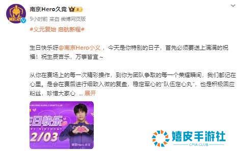 虎扑12月03日讯 今天是小义22岁生日,Hero发文:人生的每一步,都不会白走 原文如下: 生日快乐呀南京Hero小义 ,今天是你特别的日子,首先必须要送上满满的祝福!祝生辰吉乐,万事皆宜~ 从你在赛场上的每一次精彩操作,到你为团队争取的每一个荣耀瞬间,我们都记在心里。是会在赛后进行细致入微的复盘,稳定军心的“队伍定心丸”,也是积极回应粉丝,珍惜大家心意的温暖小汪。你的努力与热情一定会被更多人看到,在新的一岁里,希望你继续在赛场上坚定自己的初心,像你最爱的那句台词:“到达胜利之前无法回头!”,斩获更多的胜利与荣耀,属于你的未来,一定灿烂坦荡 人生的每一步,都不会白走,经历过风雨,也总有一天会迎来彩虹。愿你在接下来的日子里,始终被爱与温暖包围,祝你新的一岁可以拥抱更豁达的人生。最后,再次祝你生日快乐~愿你的22岁如游戏般精彩纷呈,每一个关卡都有意想不到的收获。我们在你身后,一直支持你!生日快乐,最好的热血小汪!