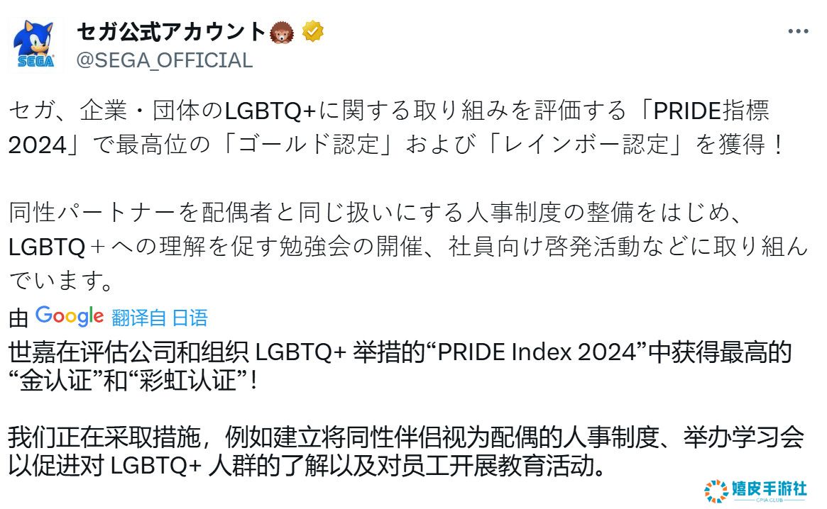 世嘉公司官推: “世嘉在评估公司和组织内LGBTQ+群体相关举措的“PRIDE指标2024”中,获得了最高级别的“金认证”和“彩虹认证”! 我们正在采取措施,例如建立将同性伴侣视为配偶的人事制度、举办学习会以促进对LGBTQ+人群的了解以及对员工开展教育活动。”