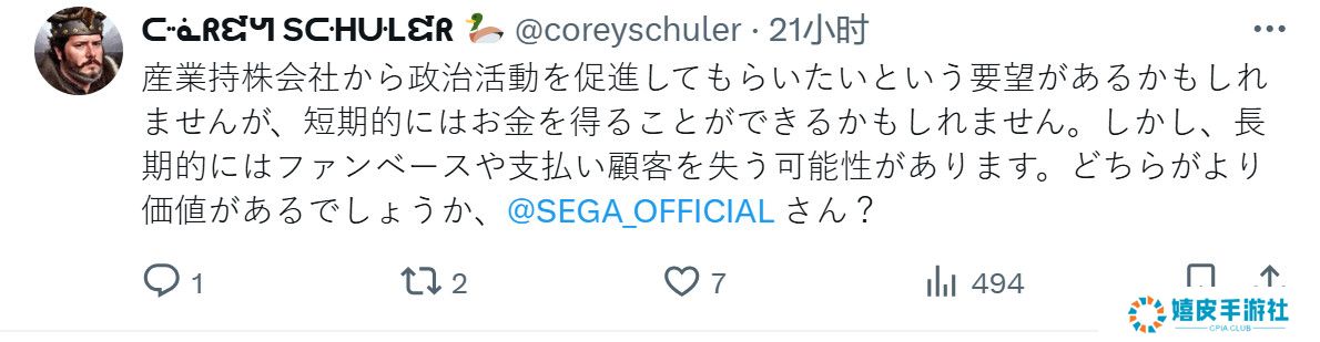 然而,底下留言的日本玩家都在劝世嘉赶紧摆脱DEI。 一名日本网友回复说:“工业控股公司可能会要求宣传其**活动,这在短期内可能会让他们赚到钱。 然而,从长远来看,你可能会失去你的粉丝群和付费客户。 哪个更有价值?@SEGA_OFFICIAL?”