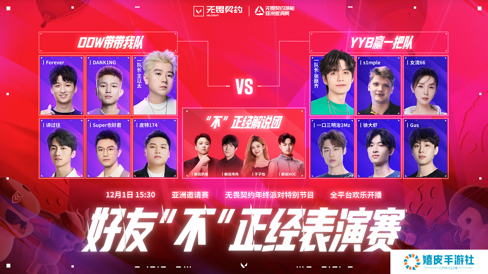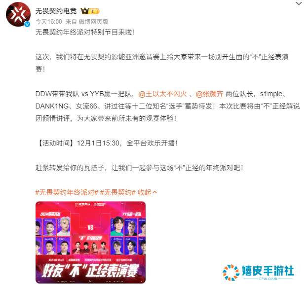 官方公告如下: 无畏契约年终派对特别节目来啦! 这次,我们将在无畏契约源能亚洲邀请赛上给大家带来一场别开生面的“不”正经表演赛! DDW带带我队 vs YYB赢一把队,@王以太不闪火 、@张颜齐 两位队长,s1mple、DANK1NG、女流66、讲过往等十二位知名“选手”蓄势待发!本次比赛将由“不”正经解说团倾情讲评,为大家带来前所未有的观赛体验! 【活动时间】12月1日15:30,全平台欢乐开播! 赶紧转发给你的瓦搭子,让我们一起参与这场“不”正经的年终派对吧!