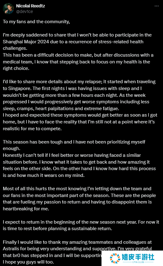“亲爱的粉丝和社区, 我非常遗憾地通知大家,由于压力相关的健康问题复发,我将无法参加2024年上海Major。这是一个艰难的决定,但经过与医疗团队的讨论,我知道专注于我的健康是正确的选择。 我想分享一下我复发的更多细节。这始于我前往新加坡的旅行。最初的几晚,我在睡眠方面遇到了问题,每晚只能睡几个小时。随着一周的推进,我的症状逐渐加重,包括睡眠减少、抽筋、心悸和极度疲惫。我曾希望这些症状在我回家后会有所改善,但我必须面对现实,我仍然没有达到可以参赛的状态。 这个赛季对我来说非常艰难,我没有足够地优先考虑自己的健康。老实说,我无法判断面对类似情况后我感觉是好是坏。我知道恢复的过程需要付出什么,以及知道健康的感觉是多么美好。另一方面,我也知道这个过程是多么艰难,以及它对我的心理造成了多大的压力。 最让我痛心的是,我知道我在这个赛季最重要的时刻让团队和我们的粉丝失望了。这些人是我重返赛场的动力,大家的失望对我来说是非常心痛的。 我期待在明年新赛季开始时回归。现在是时候休息一下,然后计划回归了。 最后,我想感谢我出色的队友和Astralis的同事们,他们给予了我极大的理解和支持。我非常感激br0的加入,我会在家支持大家,希望你们也能支持他们。”