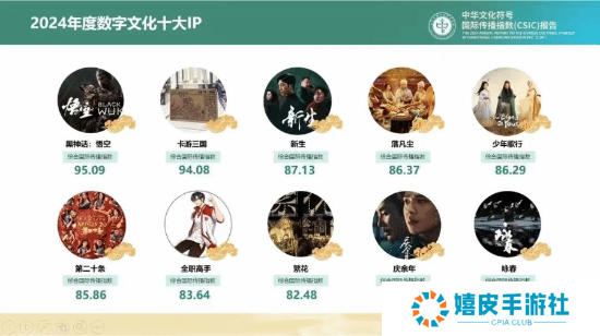 《黑神话:悟空》《卡游三国》等作为中华文化符号,荣获“2024年度数字文化十大IP”。 作为当代中国与世界研究院的品牌性研究成果,已连续两年在世界互联网大会分论坛发布,受到社会各界的广泛好评。 基于不断优化的中华文化符号国际传播指数(CSIC)模型,报告今年首次构建了年度中华文化国际传播符号矩阵,覆盖古建艺术、古典神话、非物质文化遗产、古风仙侠、中华美食和人文自然景观六个关键维度。 在综合考虑文化传播深度、文化创新性与适应性、文化影响力、受众反馈等因素的基础上,结合国际传播指数模型,报告提炼出“2024年度数字文化十大IP”。