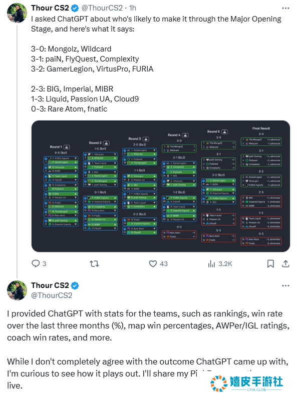 近日,数据挖掘者ThourCS2用AI预测了上海Major开幕式阶段的赛果,其中,蒙古战队与Wildcard将会3-0战绩晋级淘汰赛,而Rare Atom和fnatic战队则是0-3被淘汰出局。