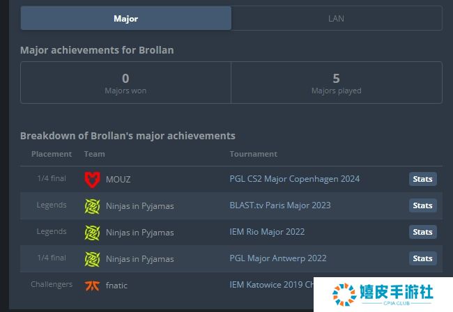 虽然今年才刚刚满22岁,但是17岁就出道的瑞典人已经有五年的职业生涯经历,其中在2019年和2020年分别进入了HLTV TOP20行列(2019年TOP19、2020年TOP15),可谓履历光鲜。 但Brollan在冲击Major冠军的道路上一直颇为不顺。他在代表 fnatic期间从未打进过Major的淘汰赛,在代表 Ninjas in Pyjamas期间,他在2022年的安特卫普Major中职业生涯首次打入八强,但是在冲击四强的路上倒在了 FaZe的枪下。今年初的哥本哈根Major,他代表MOUZ出战打进淘汰赛,但在四分之一决赛上不敌 G2,被挡在四强门外。