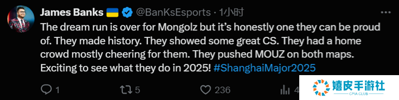 BanKs:虽然The MongolZ的梦想已经终结,但老实说他们已足以自傲。他们已经创造了历史,并且展示了一些绝佳的CS。他们有着主要为其加油助威的主场观众,而且他们在两张地图上都把MOUZ逼到了极致。很期待他们在2025年的表现。