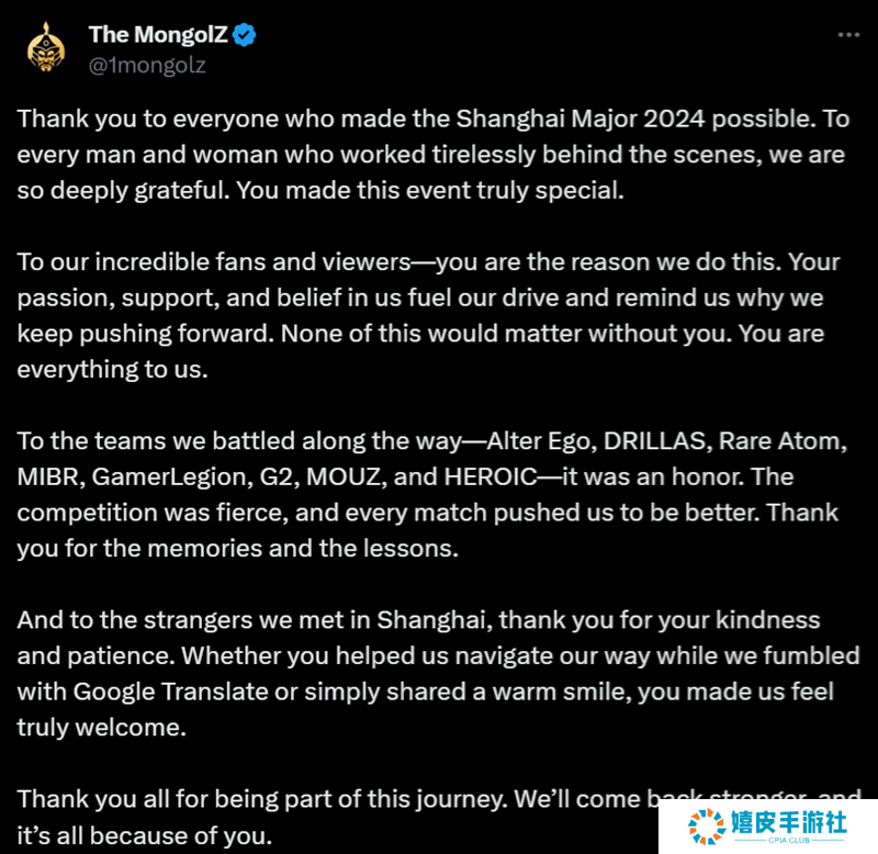 The MongolZ:感谢所有为2024年上海Major做出贡献的人。对于每一位在幕后不知疲倦工作的男士和女士们,我们深表感谢。你们让这项赛事变得真正特别。